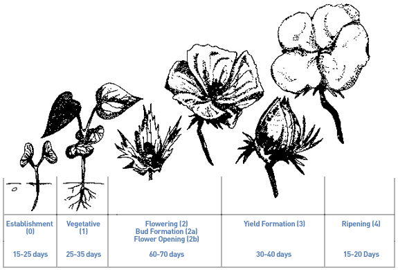 Adequate water supply is needed for vigorous growth, good budding and fruiting and for the formation of healthy bolls. Excess water early in the growing period will restrict root and crop development. Cotton requires adequate water supply particularly just prior and during bud formation (2a). Continued water supply during flower opening (2b) and yield formation (3) periods results in prolonged and excessive growth and yield. Abrupt changes in water supply will adversely affect growth and cause flower and boll shedding. Severe water deficits during flowering may fully halt growth, but with subsequent water supply crop growth recovers and flower formation is resumed.