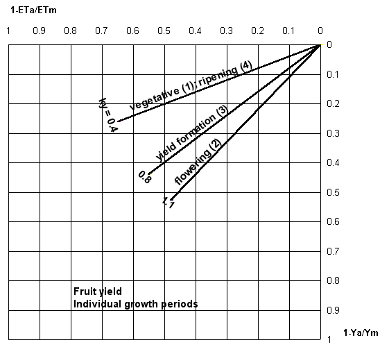 This figure shows the relationships between relative yield decrease (1 - Ya/Ym) and relative evapotranspiration deficit for the individual growth periods.
