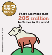 The water buffalo (Bubalus bubalis) is a large bovine species originating in Asia; not to be confused with the wild African buffalo (Syncerus caffer). Whilst its distribution is still concentrated largely in Asia small populations also exist in most other parts of the world. The vast majority of buffaloes are raised in labor-intensive, small family farms, where they provide milk and serve important functions as draft animals, particularly in rice production. Buffalo milk has important nutritional value; it has twice the calorific content of cow’s milk, is extremely rich in calcium and is a good source of minerals like magnesium, potassium and phosphorus.
