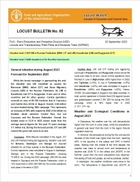 While the locust campaign is approaching the end, the situation was still classified as caution for Moroccan (DMA), Italian (CIT) and Asian Migratory Locusts (LMI) in the Russian Federation, for LMI in Kazakhstan and CIT in Kyrgyzstan. It was calm in other countries and for other species. Control operations covered an area of 89 536 hectares (ha) in Caucasus and Central Asia (CCA) in August. Overall, 2.68 million ha were treated during 2023 campaign. This represents an increase of 38% with respect to 2022 (1.94 million ha treated), which concerns Central Asia, but not Caucasus and the Russian Federation. Overall, the treated areas in CCA in 2023 remain lower than the average annual figures for the past 15 years (average 3.7 million ha). During the forecast period, CIT and LMI natural life cycles will come to an end.