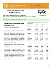 The life cycles of the three main locust species in Caucasus and Central Asia (CCA) - the Moroccan Locust (DMA), Italian Locust (CIT) and Asian Migratory Locust (LMI) - concluded in late summer to early autumn. Eggs will stay in the soil in embryonic diapause, until they hatch in spring. DMA hatching may start from end of February/early March in the southern parts of Central Asia (Afghanistan, Tajikistan and Uzbekistan). No hatching of any other species is expected in CCA till end of March.