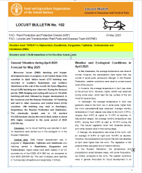 Moroccan locust (DMA) hatching and hopper development were in progress in all Central Asian (CA) countries in April. Italian locust (CIT) hatching was recorded in southern Kazakhstan and northern Uzbekistan at the end of the month. No Asian Migratory locust (LMI) hatching was observed. During the forecast period, DMA fledging and mating will occur in CA while hatching will start, followed by hopper development, in the Caucasus and the Russian Federation. CIT hatching will start in other Caucasus and Central Asian (CCA) countries. LMI hatching may start in Azerbaijan, Kazakhstan, the Russian Federation and Uzbekistan. The chemically treated area in CA reached 614 556 hectares (ha) by the end of April, which is about 80% higher compared to the same period of 2024 (335 094 ha).