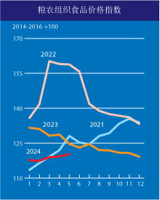 粮农组织食品价格指数是衡量一揽子食品类商品国际价格月度变化的尺度。它由五个商品类别的价格指数的加权平均数构成,权数为2014–2016年各商品类别的平均出口贸易比重。2020年6月版《粮食展望》登载的一篇专题文章介绍了自2020年7月起实行的该指数计算基期调整及其价格覆盖范围扩大。2013年11月的一篇文章载有有关该指数先前构建方法的技术背景。
