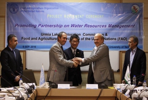 ووقع الاتفاق ووثائق المشروع السيد سيرج ناكوزي ممثل منظمة الفاو في جمهورية إيران الإسلامية وفي منظمة التعاون الاقتصادي، والدكتور عيسى كلانتاري مستشار الرئيس الإيراني لشؤون المياه والزراعة والبيئة وسكرتير لجنة استعادة بحيرة أرومية، وذلك بحضور السفير الياباني لدى إيران هيروياسو كوباياشي.