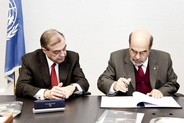 Ceremonia de firma en Roma entre el Director General de la FAO, José Graziano da Silva y el Presidente de la Academia Internacional de Gastronomía, Jacques Mallard