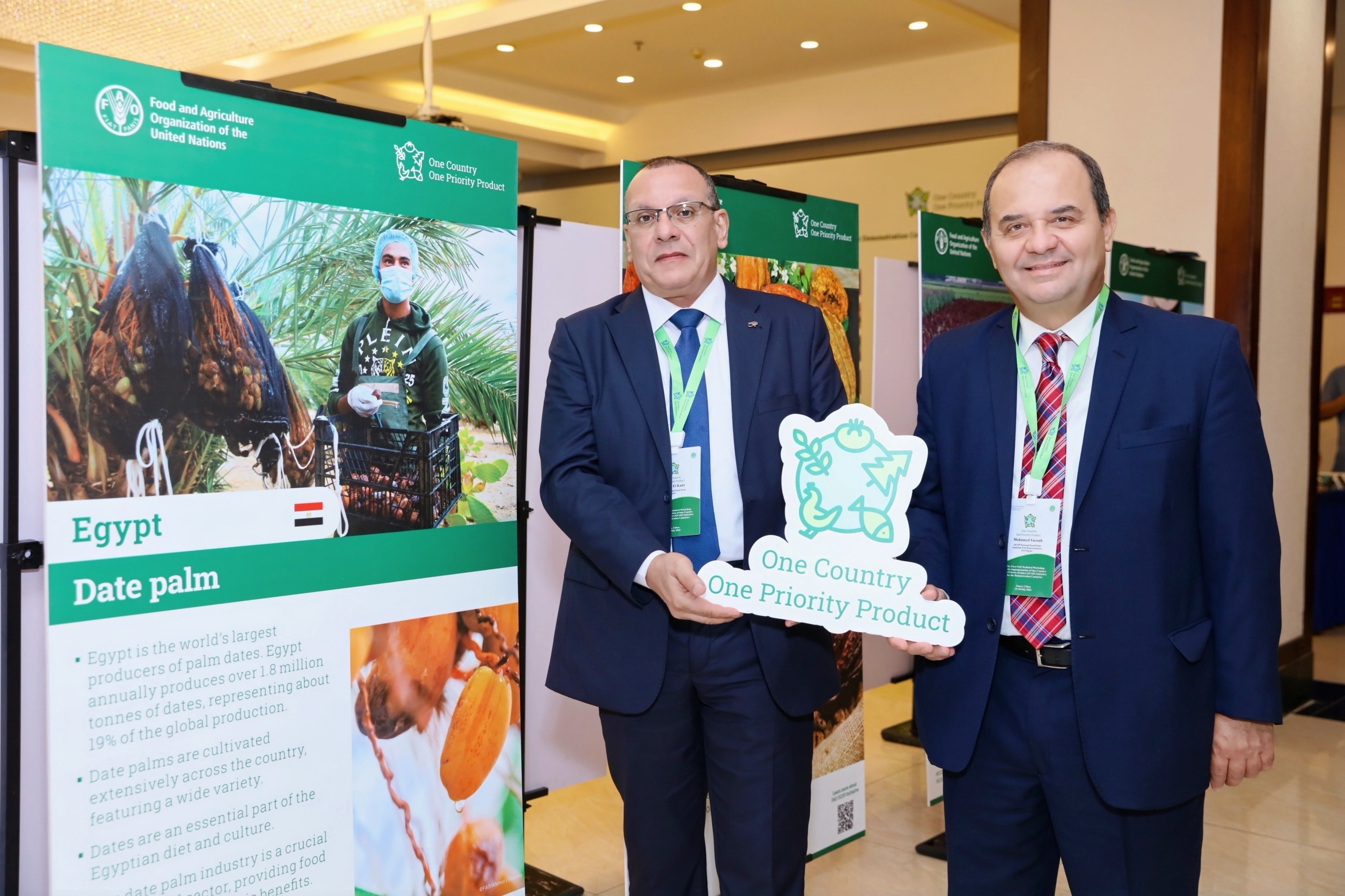 来自埃及的一国一品负责人埃及贸易和工业部食品和农业工业技术中心执行主任Amgad El Kady(左)和粮农组织驻埃及代表处副代表Mohamed Yacoub(右)展示埃及特色农产品椰枣及相关知识产品。 ©粮农组织