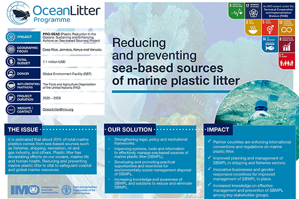 The OceanLitter Programme is an IMO global initiative to prevent and reduce marine litter, in particular marine plastic litter (MPL), within the maritime transport and fisheries sectors executed in collaboration with FAO. Projects under the OceanLitter Programme support developing countries to reduce, monitor, and prevent marine plastic litter from all types of ships, including fishing vessels. Within the existing policy and regulatory frameworks and strategically linking with other on-going global and regional initiatives related to marine plastic litter (MPL), the Programme aims to: