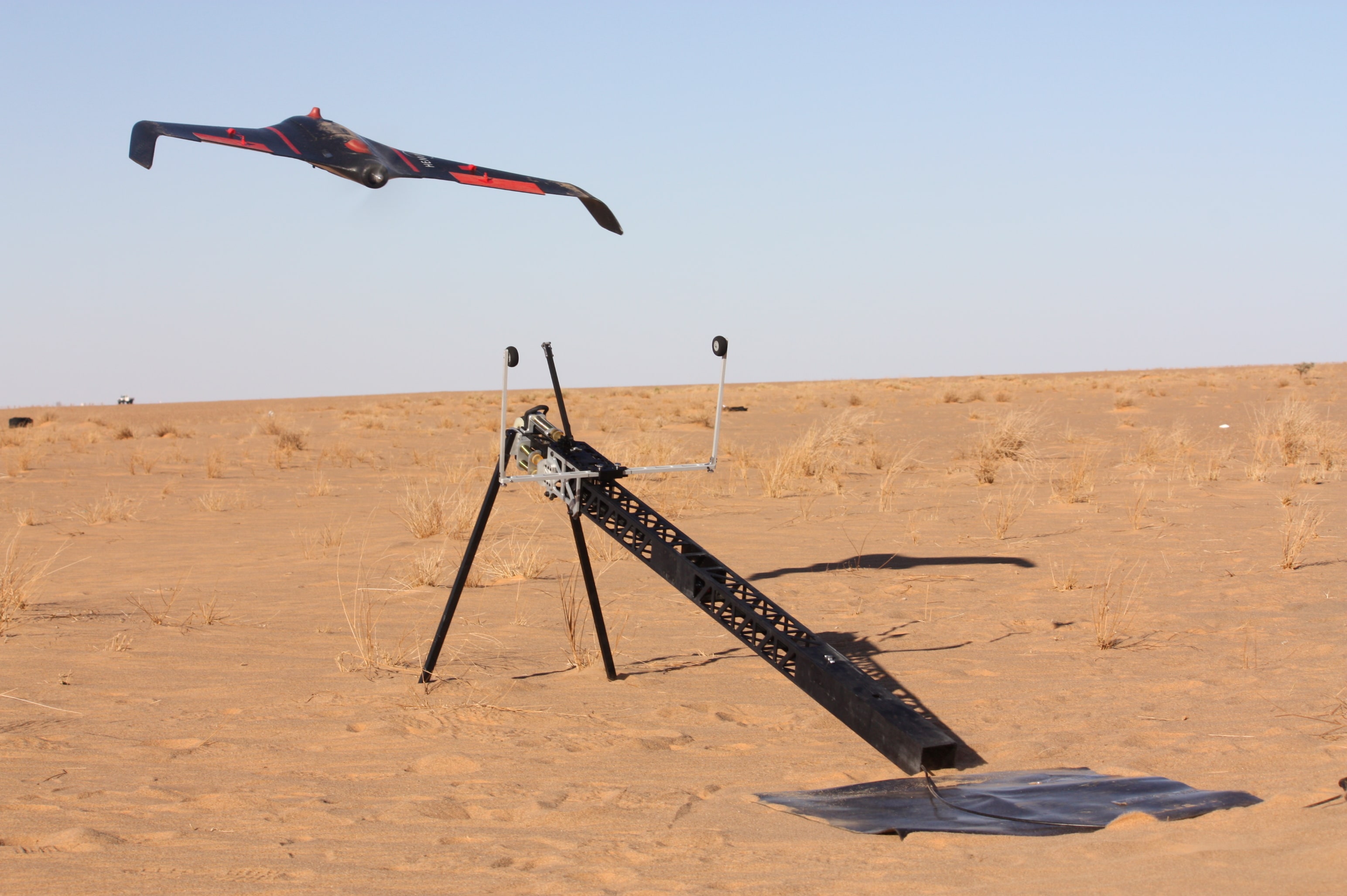 Left/top: Drone Focal Points from Algeria (Bilal Serir), Mali (Hamady Ba) and Saudi Arabie (Fahad Al-Shamrani) collecting environment data after a drone flight. @FAO/Yasser Abdesselam. Right/bottom: The first test prototype of the fixed-wing HEMAV HP-2 Drone launched from its catapult. @FAO/Hichem Dridi.