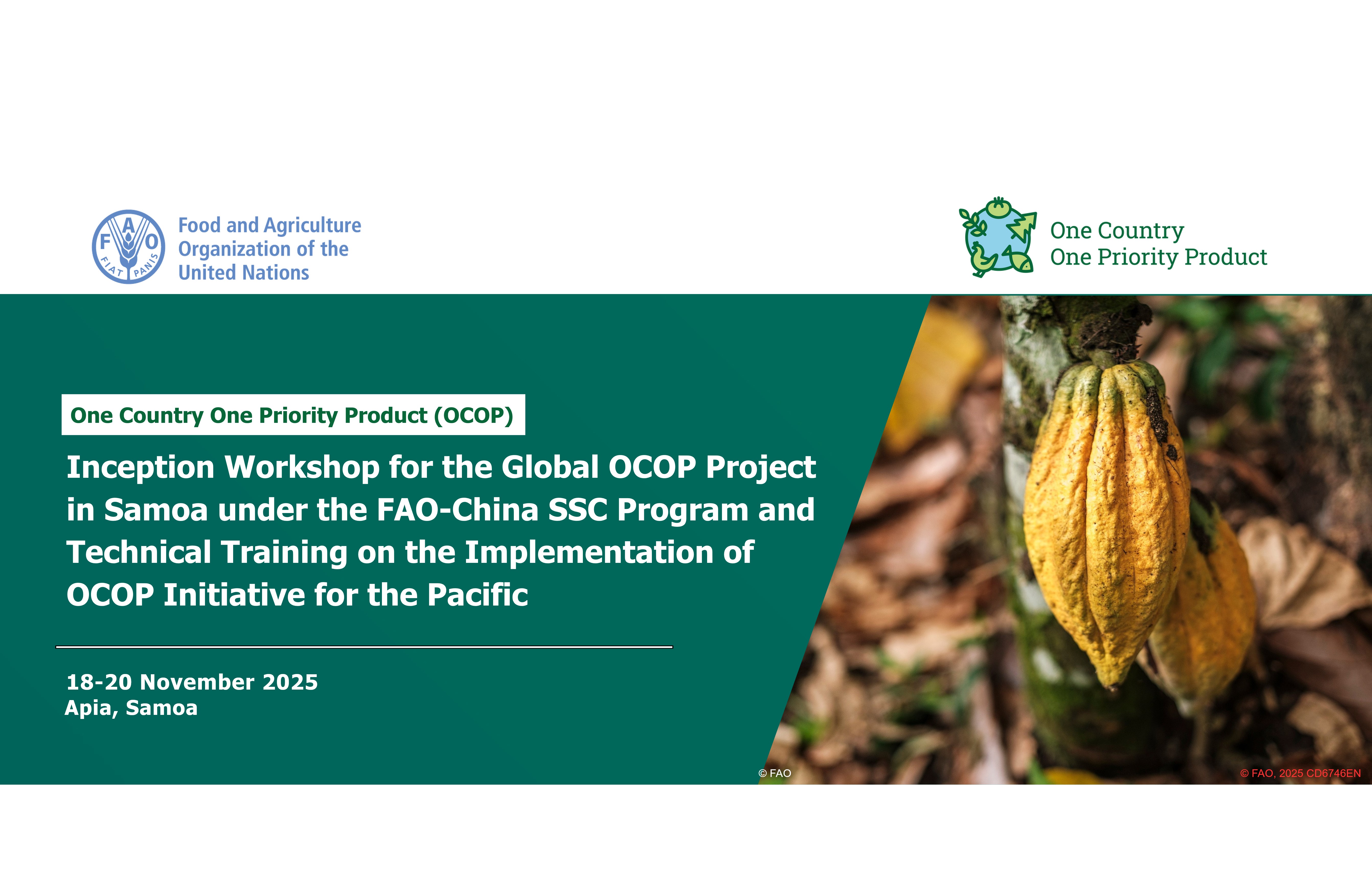The inception workshop for the Global Project in Samoa under the FAO-China South-South Cooperation Programme and Technical Training on the Implementation of One Country One Priority Product Initiative for the Pacific region will be organized in Samoa. Samoa is the OCOP project country to lead which will showcase and facilitate the implementation of the OCOP initiative in the region. Meanwhile, a Technical Training Course on the Implementation of the OCOP Initiative for the Pacific will be also organized in synergy with the ongoing FAO subregional TCP project “Pacific One Country One Priority Product (P-OCOP) for agrifood system transformation” (TCP/SAP/4003), to promote sustainable development of the special agricultural products in other seven OCOP countries in the subregion.
