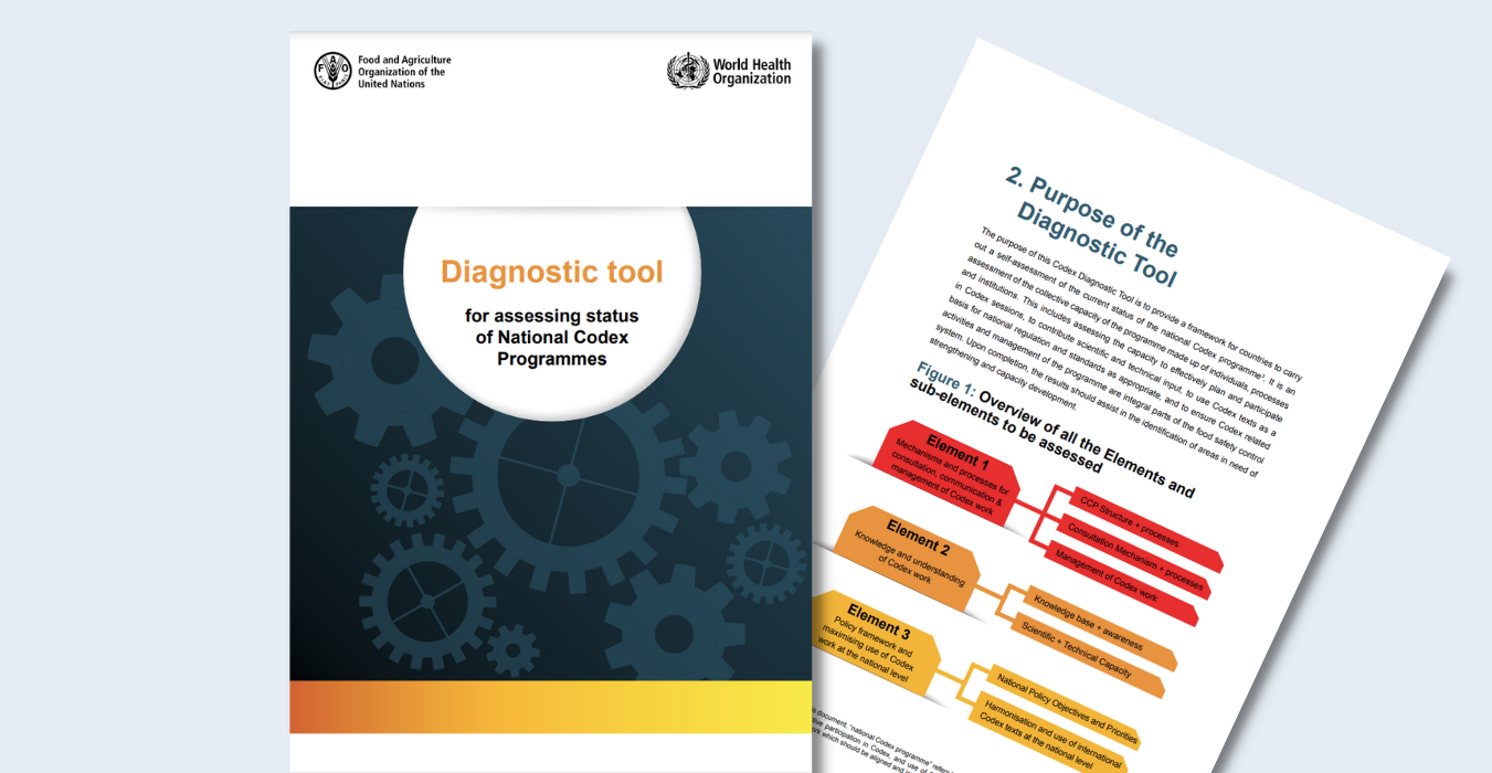 The purpose of this Codex Diagnostic Tool is to provide a framework for countries to carry out a self-assessment of the current status of the national Codex programme. The Tool outlines the main elements, sub-elements, and best practices that need to be in place in any national Codex programme and through the process of self-assessment, countries can assess the collective capacity of the programme made up of individuals, processes and institutions. This includes assessing the capacity to effecti vely plan and participate in Codex sessions, to contribute scientific and technical input, to use Codex texts as a basis for national regulation and standards as appropriate, and to ensure Codex related activities and management of the programme are integral parts of the food safety control system. Using the results of the self-assessment countries identify areas in need of strengthening and capacity development, and can ensure the national Codex programme is fit for purpose, addresses nationa l interests and priorities and is adaptive to change and evolving needs. The results of the assessment can be used to inform ongoing national workplans and/or form the basis of a request for technical assistance if external support is required to improve national capacities. One potential source of external support is the FAO/WHO Codex Trust Fund (CTF2).