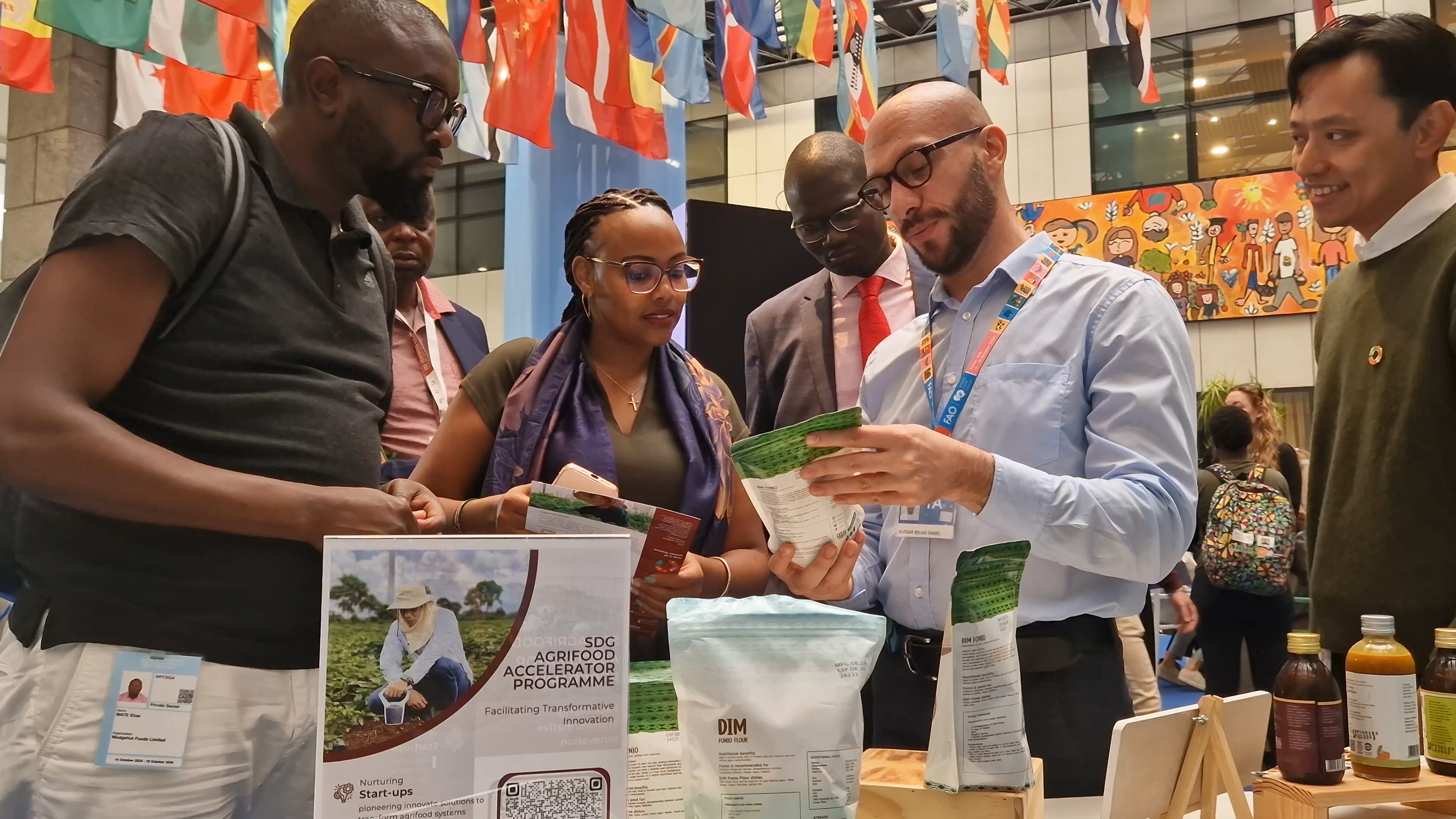 Innovations from small and medium enterprises (SMEs) caught the attention of numerous international attendees at the 2024 World Food Forum. As part of FAO’s SDG Agrifood Accelerator Programme, which provides coaching to agrifood systems start-ups to help them develop their business while accelerating the SDGs, a few of the beneficiaries displayed in a stand in the atrium of FAO headquarters and shared how the Programme has helped them.
