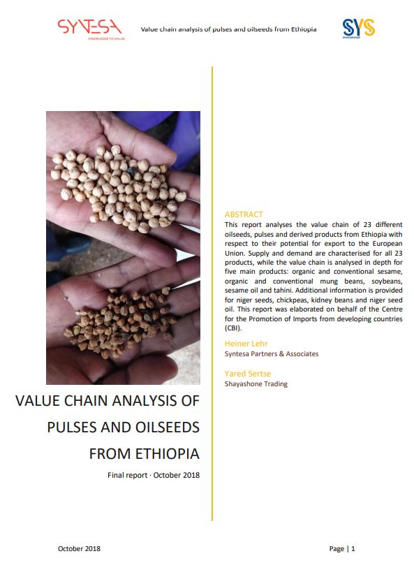 This report analyses the value chain of 23 different oilseeds, pulses and derived products from Ethiopia with respect to their potential for export to the European Union. Supply and demand are characterised for all 23 products, while the value chain is analysed in depth for five main products: organic and conventional sesame, organic and conventional mung beans, soybeans, sesame oil and tahini. Additional information is provided for niger seeds, chickpeas, kidney beans and niger seed oil. This report was elaborated on behalf of the Centre for the Promotion of Imports from developing countries (CBI).