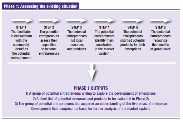 Phase 1 should provide a realistic indication of enterprise prospects, taking into consideration the available resources, social conditions, financing, market demand and potential investors. The objective is to help potential entrepreneurs discover the products that are best suited to their economic situations while ensuring that the resource is used sustainably. To create viable enterprises and reduced risks, potential entrepreneurs learn to select enterprise ideas that take into account social, environmental, institutional and technological factors.