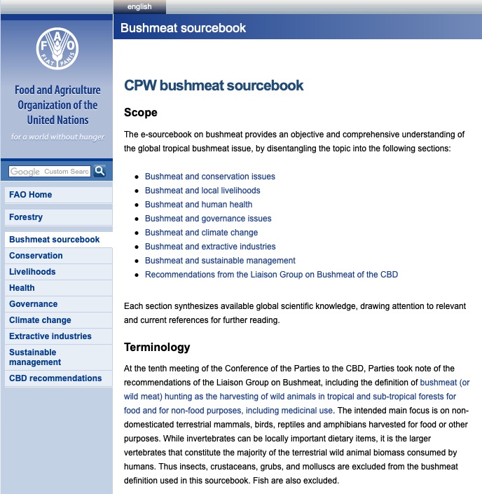 This e-sourcebook provides a comprehensive understanding of the global tropical bushmeat issues. It contains seven sections wich synthesize available global scientific knowledge on bushmeat issues relating to conservation, local livelihoods, human health, governance, climate change, extractives industries and sustainable management. In addition, it provides reference for further reading and the revised recommendations of the Convention on Biological Diversity Liason Grop on Bushmeat as they appear in the COP 11 Decision XI/25 document.