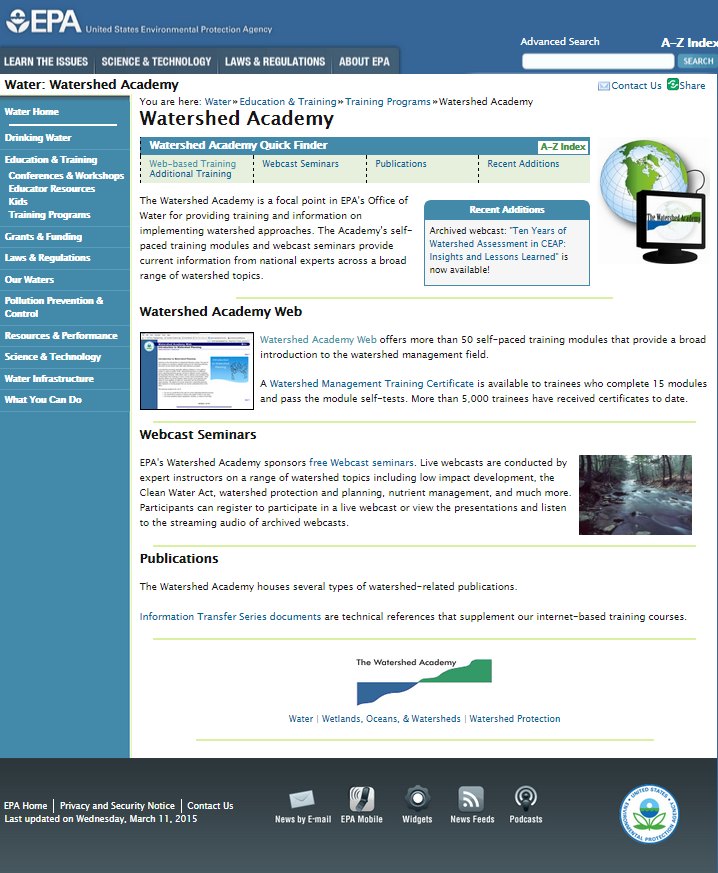 The Watershed Academy is a focal point in the US Environmental Protection Agency (EPA) Office of Water for providing training and information on implementing watershed approaches. The Academy's self-paced training modules and webcast seminars provide current information from national experts across a broad range of watershed topics.