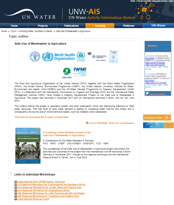 The UN-Water Activity Information System (UNW-AIS) is an online platform to present and share information on water-related projects and learning initiatives from UN-Water and its members and partners. UNW-AIS is a platform for UN-Water and its members & partners as well as a broader audience including policy makers, water professionals, researchers and those from higher education for sharing information and knowledge from global to local level. It also contains useful documents and guidelines prepared by UN agencies on the use of treated wastewater in agriculture.