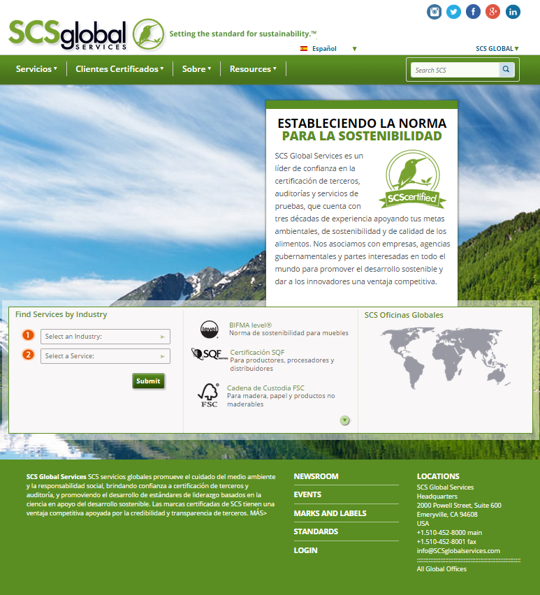 SCS Global Services, previamente conocida como Scientific Certification Systems, Inc., es una empresa de confianza, líder en certificaciones, auditorías, pruebas y elaboración de normas externas en cuestiones de medio ambiente, sostenibilidad y calidad de los alimentos.
