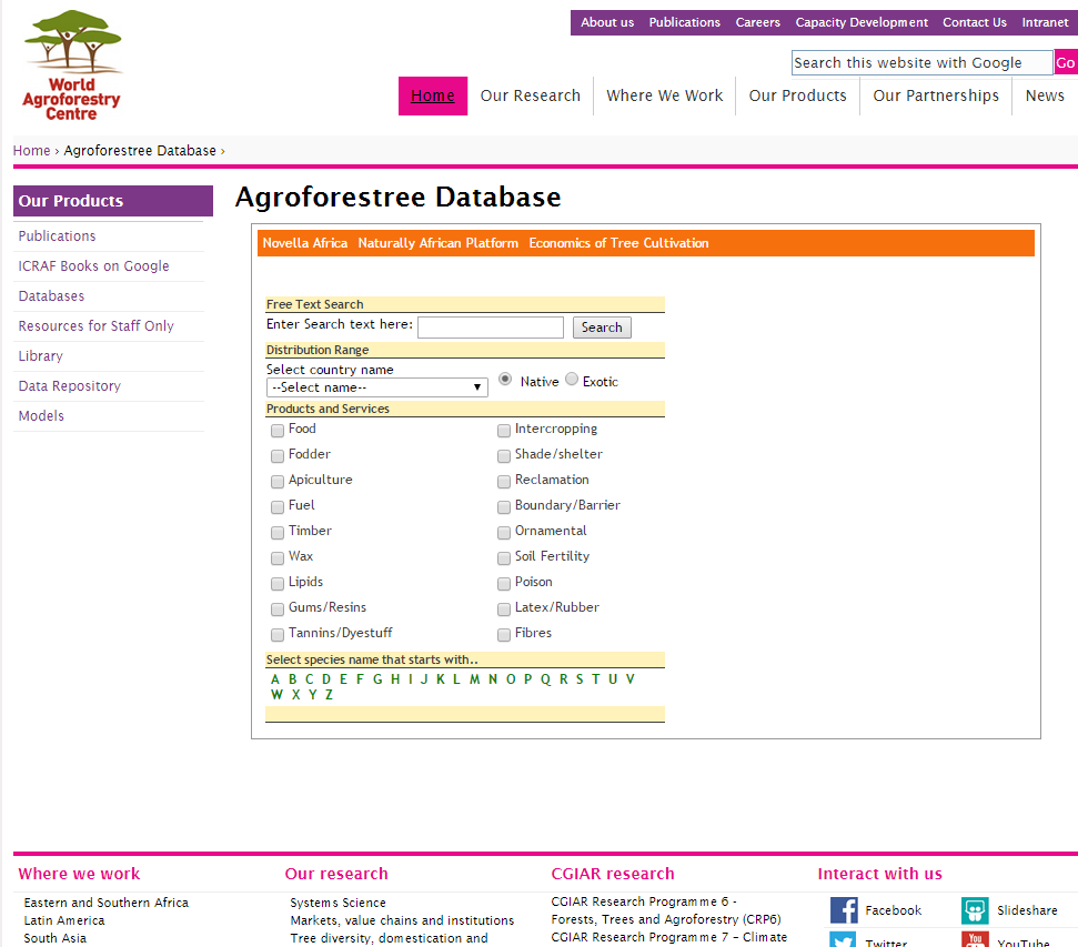 The Agroforestree database contains a wide number of species that can be used in agroforestry systems. The search can be narrowed according, to country of interest and agroforestry sectors. At the end of the search a number of species is given. The species are presented in form of factsheet where technical advices on tree management and use of the plant are collected and clearly explained.