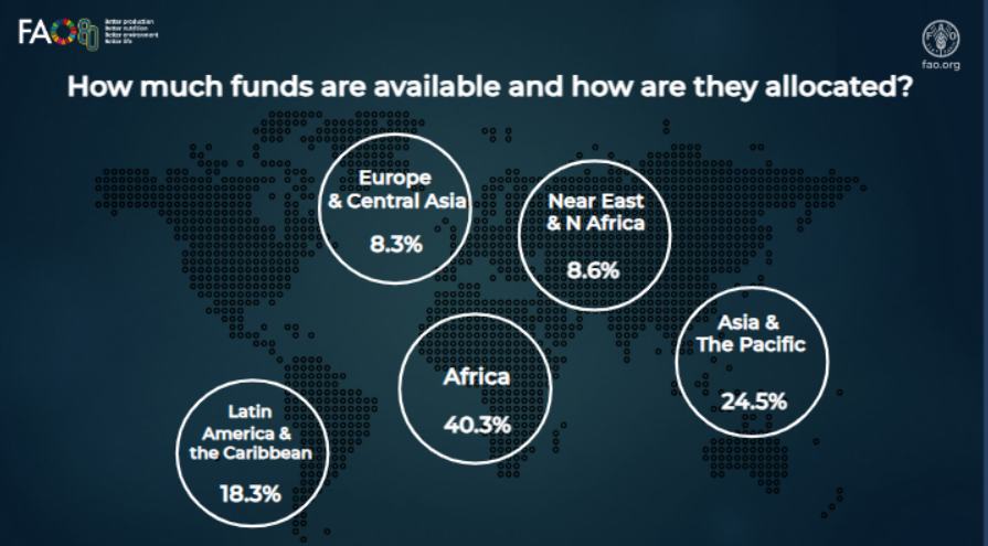 وبلغت اعتمادات برنامج التعاون التقني للفترة المالية 2025-2024 مبلغًا قيمته 141.3 مليون دولار أمريكي، أي 14 في المائة من ميزانية البرنامج العادي للمنظمة. وتجري إدارة الأموال المخصصة للمشاريع في حالات الطوارئ (وتمثل 15 في المائة من المجموع) والمشاريع المشتركة بين الأقاليم (وتمثل 3 في المائة من المجموع) من المقر الرئيسي، فيما تقوم المكاتب الميدانية بتخصيص الجزء الأكبر من الموارد وإدارتها (وتمثل 82 في المائة من المجموع) بما يتماشى مع الحصص التي حددتها الأجهزة الرئاسية.