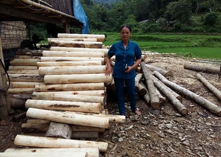 - Ms. Hoang Thi Mai stands next to May Phay’s timber production