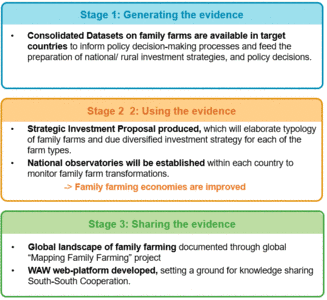 In the first stage (generating the information), WAW will compile consolidated datasets on family farms. First, country teams will conduct a review of existing information at farm and household level to see what data are available and where any gaps might be. They will then conduct field surveys to gather any information that is missing. WAW will then consolidate the data using existing information systems.