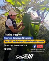 Durante el 8 y 9 de enero de 2026, la Agencia de Regulación y Control Fito y Zoosanitario (Agrocalidad) organizó el seminario en modalidad streaming “Foc R4T Bajo la Lupa: Cada decisión cuenta”, con el objetivo de fortalecer los conocimientos técnicos sobre la prevención, el manejo de brotes y el control de los riesgos de dispersión del Fusarium Raza Tropical 4 (Foc R4T)