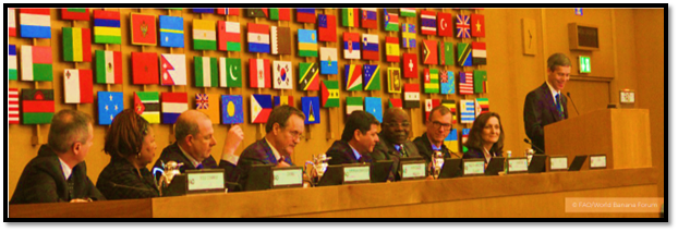 Xavier Roussel (Dole Food Company), Iris Mungia (COLSIBA), Leonard Mizzi (European Commission – DG INPA), Lieven De La Marche (Permanent Representation of Belgium to FAO, WFP, and IFAD), Ricardo Palacios (Ministry of Agriculture of Ecuador), Médi Moungui (Permanent Representation of Cameroon to FAO, WFP, and IFAD), Patrick Belser (International Labour Organization – ILO), and Marike de Peña (CLAC).