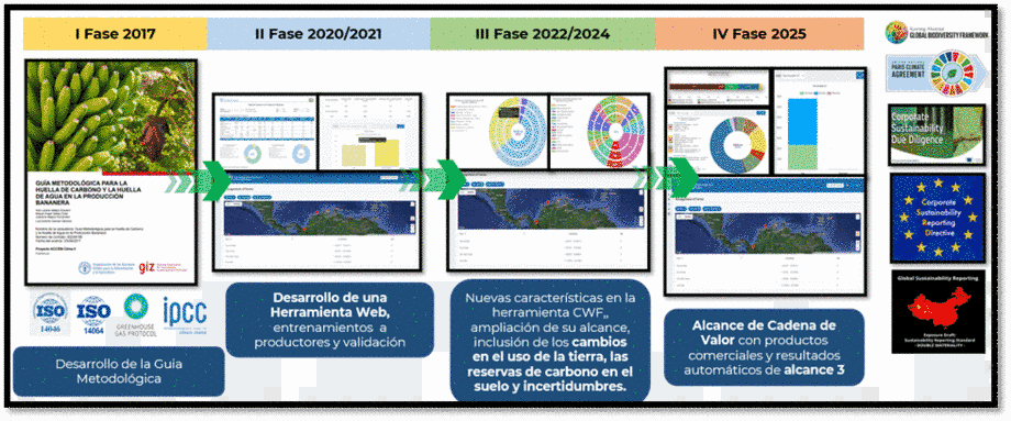 FASE II (2020): Creación de una herramienta automatizada en la nube basada en la guía metodológica, facilitando el acceso a la evaluación de huellas. Esta fase incluyó sesiones de capacitación y validación en colaboración con asociaciones de productores en Ecuador, Colombia, Costa Rica y Guatemala.