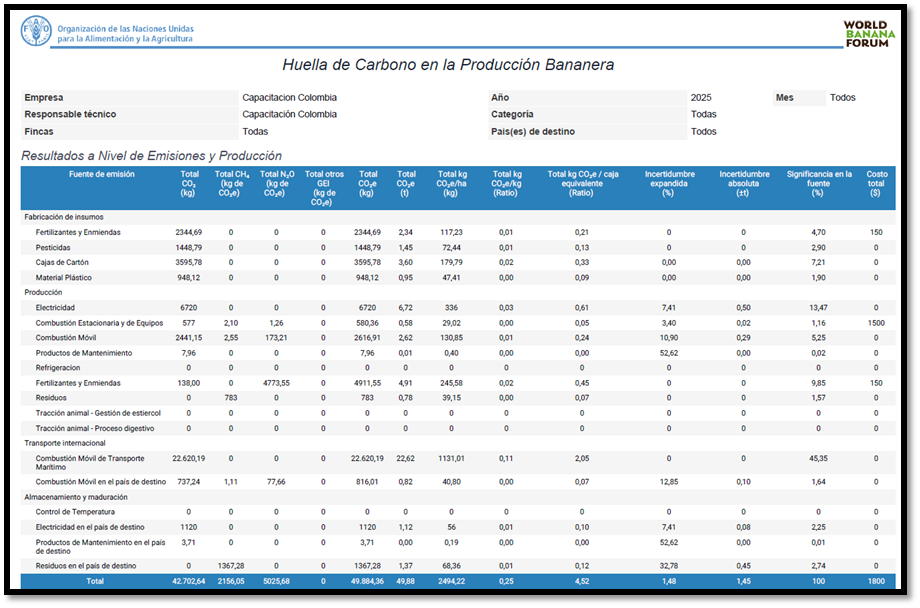 FASE IV (2024 - 2025): Renovación completa de la arquitectura del software, con el desarrollo de nuevos módulos para captar las emisiones de alcance 3, incluida la fabricación de insumos, el transporte marítimo, las operaciones de almacenamiento y maduración, y el transporte terrestre en el país de destino. Esto marca la transición de un enfoque de estimación de huella a nivel organizacional a un enfoque de producto, en línea con los estándares y directrices globales más recientes. También se integraron amplias bases de datos de fertilizantes comerciales, pesticidas y otros insumos clave, que permiten calcular automáticamente las emisiones de fabricación, los impactos en los recursos hídricos y las emisiones a nivel de campo.