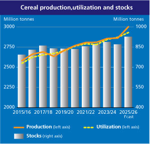 World cereal utilization in 2025/26 continues to point to an increase of 59.2 million tonnes (2.1 percent) from 2024/25 with increases in the use of all major cereals, led by maize and rice. With prices stable and supplies ample, major producers of coarse grains are expected to use more maize (and, to a lesser extent, barley and sorghum) for animal feed while feed-quality wheat may represent an economically attractive alternative to other non-cereal feed ingredients. The forecast for global cereal utilization is up just slightly from the previous month with total utilization of coarse grains in 2025/26 lowered marginally, an upward revision to barley utilization for feed in Argentina being outweighed by slight downward adjustments to maize utilization for feed in Brazil and the European Union. Abundant supplies are forecast to facilitate a 2.4 percent annual expansion in global rice utilization in 2025/26 to a fresh peak of 552.8 million tonnes.