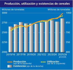 El pronóstico sobre la utilización mundial de cereales en 2025/26 se ha establecido en 2 929 millones de toneladas, es decir, 51,9 millones de toneladas, o un 1,8 %, más que en 2024/25. Se estima que el aumento obedecerá principalmente a la abundancia de la oferta y la bajada de los precios. Se prevé que la utilización de cereales como pienso subirá un 2,1 %, ya que los principales productores, como el Brasil y los Estados Unidos de América, destinarán más maíz a la alimentación animal, mientras que en Asia se atenderá a la fuerte demanda de la acuicultura mediante la importación de trigo de calidad forrajera. Aumentarán asimismo los otros usos de los cereales, en particular en el caso del maíz. El pronóstico indica que el consumo humano de cereales subirá ligeramente, como consecuencia del crecimiento demográfico y cambios graduales en los hábitos alimentarios.